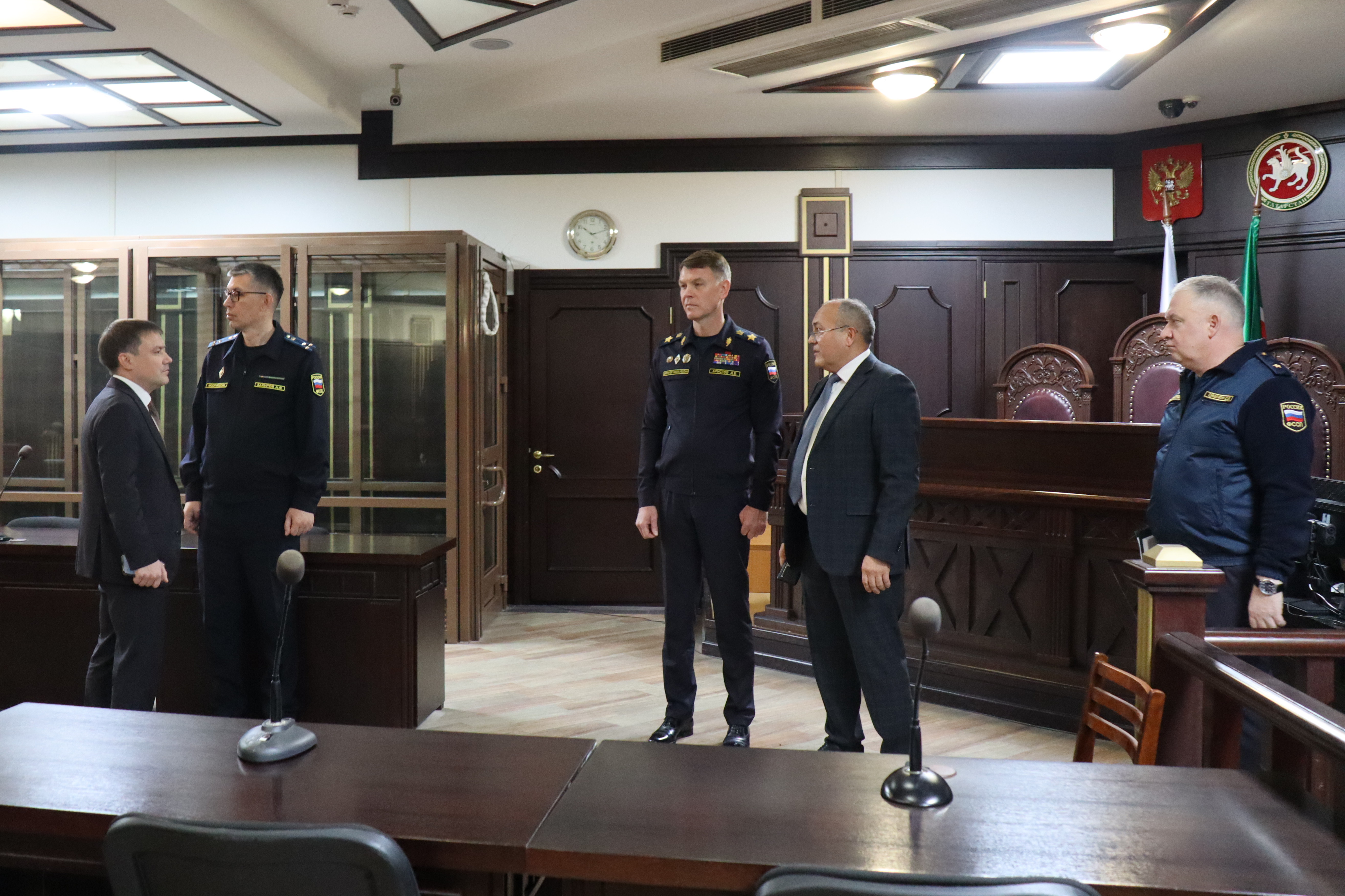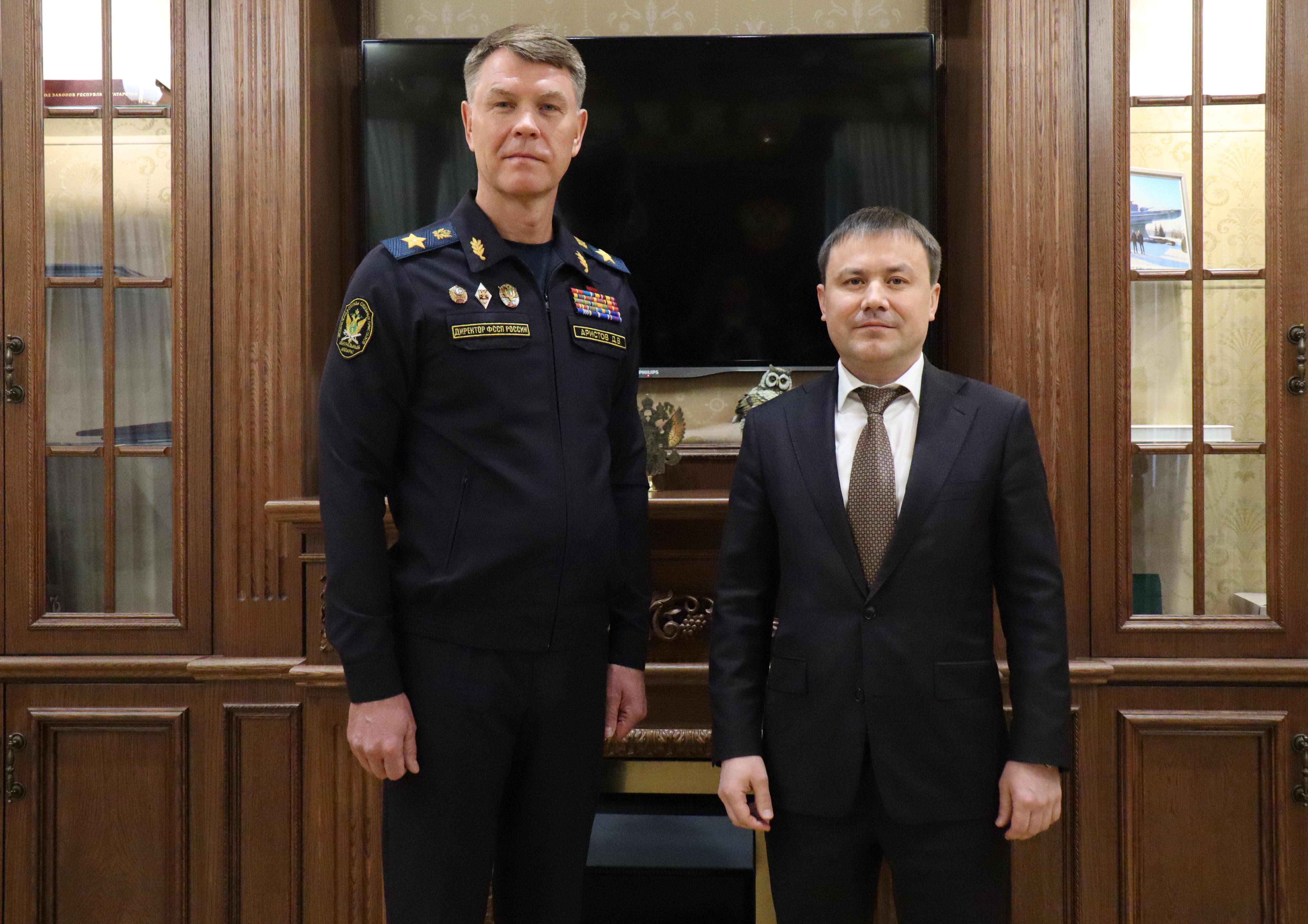 Сегодня Верховный Суд Республики Татарстан с рабочим визитом посетил директор Федеральной службы судебных приставов - главный судебный пристав Российской Федерации Дмитрий Аристов. Его сопровождал руководитель Главного управления Федеральной службы судебных приставов по Республике Татарстан Анвар Закиров. Гости встретились с Председателем Верховного Суда Республики Татарстан Азатом Гильмутдиновым, его заместителем Айдаром Галиакберовым, ознакомились с системой обеспечения безопасности здания суда. Дмитрий Васильевич проконтролировал работу представителей службы судебных приставов на рабочих местах.